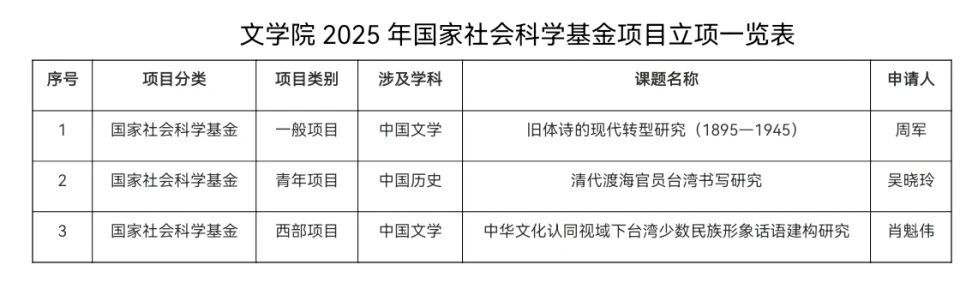 近日,全国哲学社会科学工作办公室公布2025年度国家社会科学基金年度项目立项结果,闽南师范大学文学院喜获1个一般项目,1个青年项目,1个西部项目。