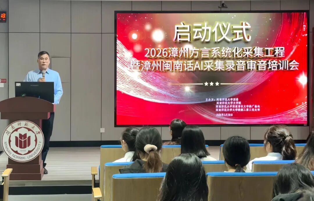 为我校顺利展开漳州方言系统化采集工程,全面提升漳州闽南话AI采集录音审音工作质量。3月30日,漳州方言系统化采集工程暨漳州闽南话AI采集录音审音培训会在博东109召开,本次活动由闽南师范大学团委、文学院、国家语言文字推广基地及文学院教工第三党支部联合主办,文学院党委书记林晓、文学院院长陈练军参加会议并作发言,图书馆傅倩琛老师就闽南语常用字与普通话进行比较分析,会议由文学院教工第三党支部书记洪水英主持。