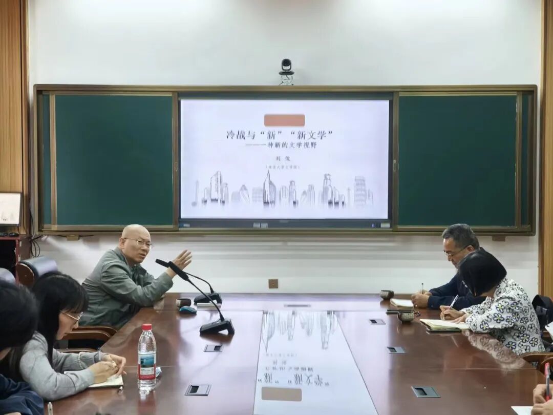 10月22日上午,中国世界华文文学学会副会长、南京大学文学院博士生导师刘俊教授,应邀于博东110会议室开展题为“冷战与‘新’‘新文学’——一种新的文学视野”的学术讲座,该讲座系台港澳与海外华人文学系列讲座第8讲。本场讲座由文学院胡明贵教授主持,向忆秋教授、吴思捷博士、梁翠琴博士与数十名硕博研究生参与。