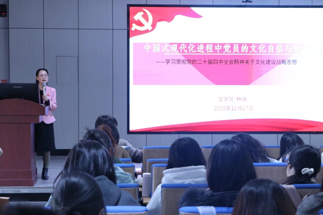 为推动党的二十届四中全会精神学习宣传贯彻走深走实,在文学院第八期正式党员培训班上,我院党委书记林晓以《中国式现代化进程中党员的文化自信与使命担当》为题,为全体师生党员讲授专题党课。