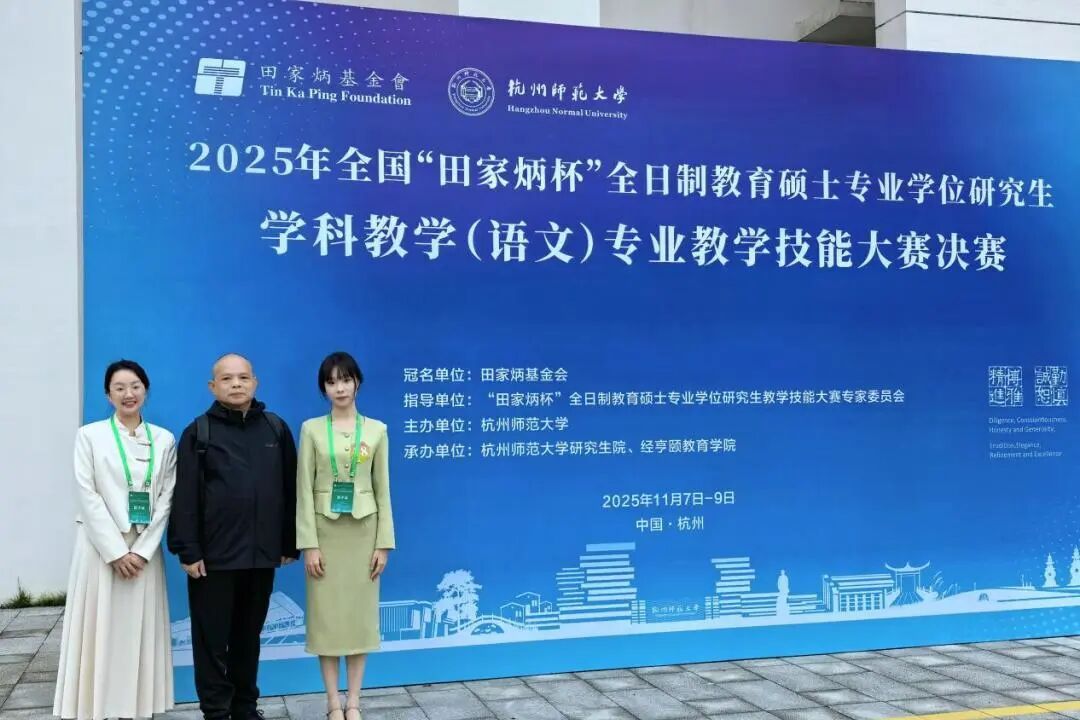 11月7日至9日,2025年全国“田家炳杯”全日制教育硕士专业学位研究生学科教学(语文)专业教学技能大赛决赛在杭州师范大学圆满落幕。经过激烈角逐,我院2024级学科教学(语文)专业研究生范清雯、陈峥妃同学在陈文明老师的指导下表现卓越,范清雯同学荣获全国一等奖,陈峥妃同学荣获全国二等奖,陈文明老师获评“优秀指导教师”荣誉称号。