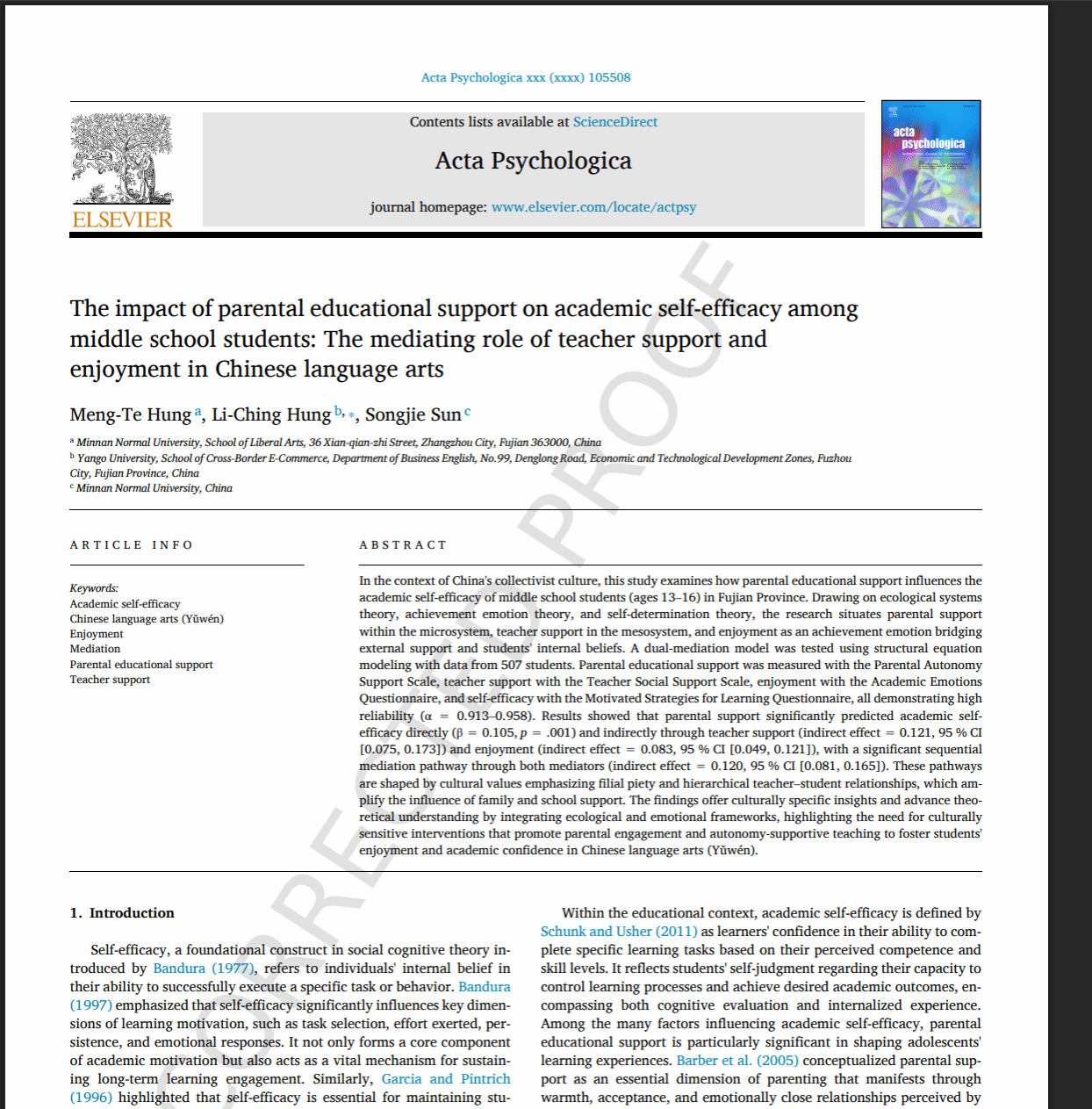 近日,我院2022级卓越教师人才实验班孙松洁,在国际权威刊物《Acta Psychologica》(IF = 2.7,JCR 2区)上发表了题为《The impact of parental educational support on academic self-efficacy among middle school students: The mediating role of teacher support and enjoyment in Chinese language arts》的学术论文。该论文的第一作者为洪孟德老师,通讯作者为美国学者Li-Ching Hung教授,闽南师范大学文学院为第一作者单位。